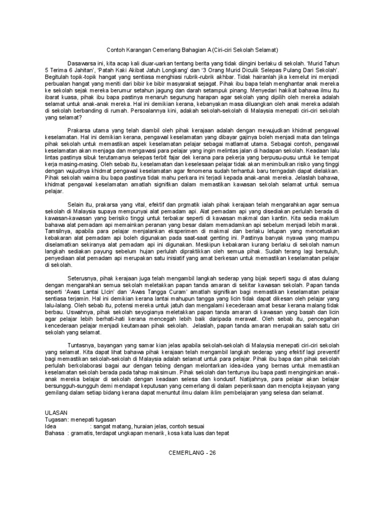 Contoh karangan cemerlang bahagian a ciri ciri sekolah selamat. Selain itu setiap kelas mempunyai pelan. Kempen Sekolah Selamat haruslah diuar-uarkan.